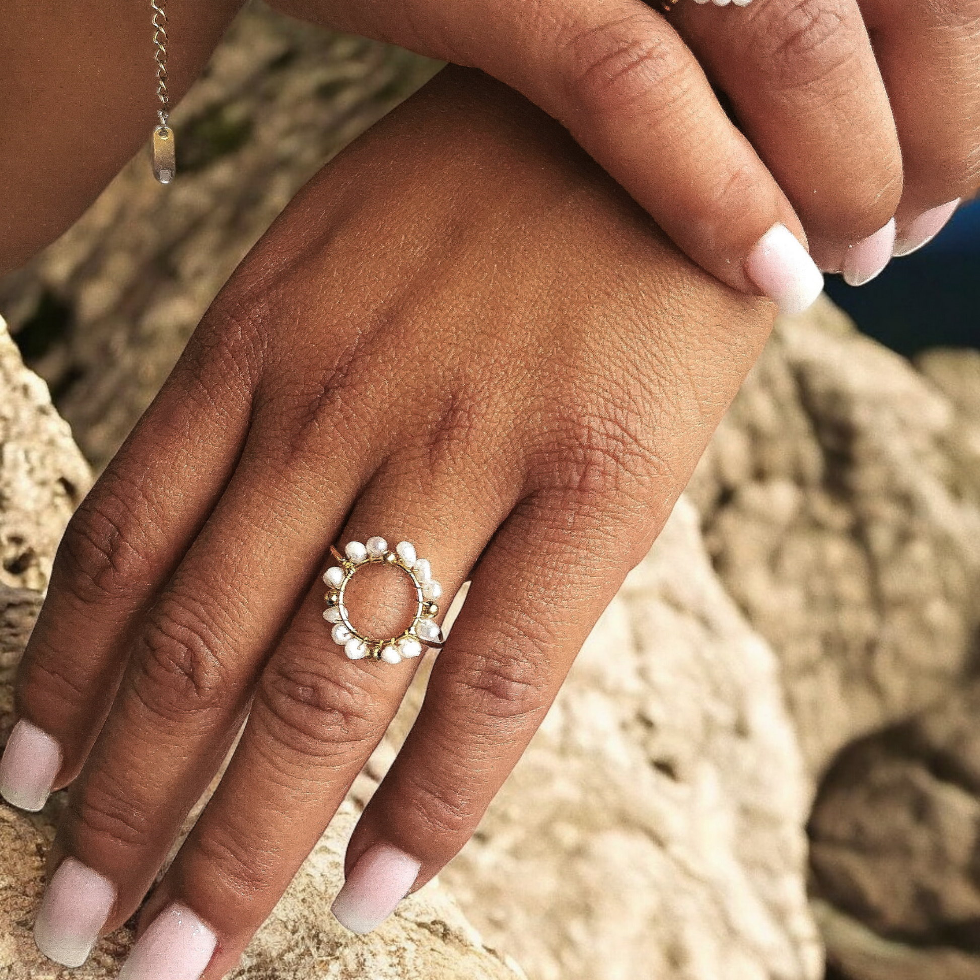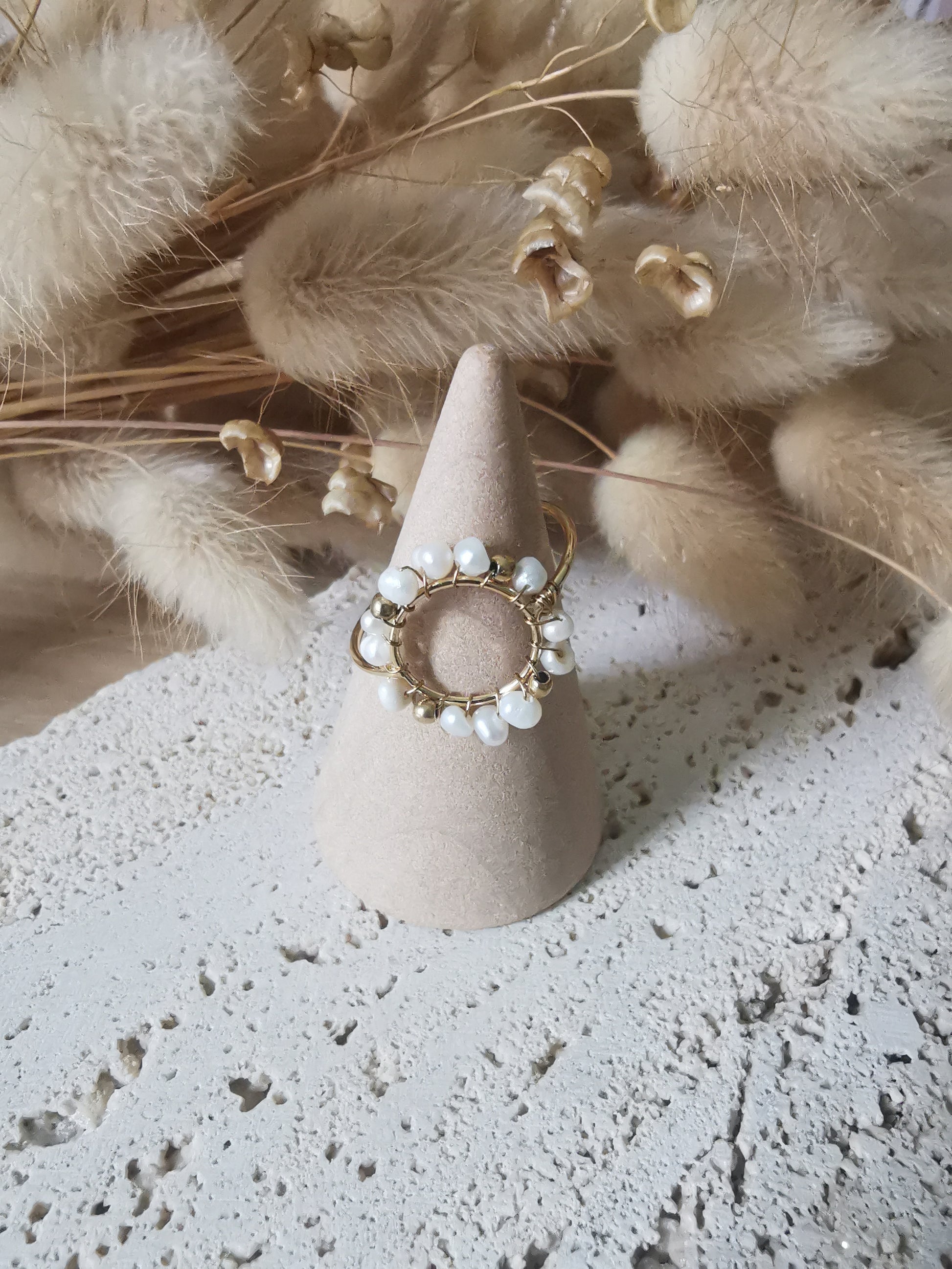 Bague fine en acier inoxydable composée d'un anneau en forme de cercle, serti de perles en acier inoxydable et de petites pierres naturelles.