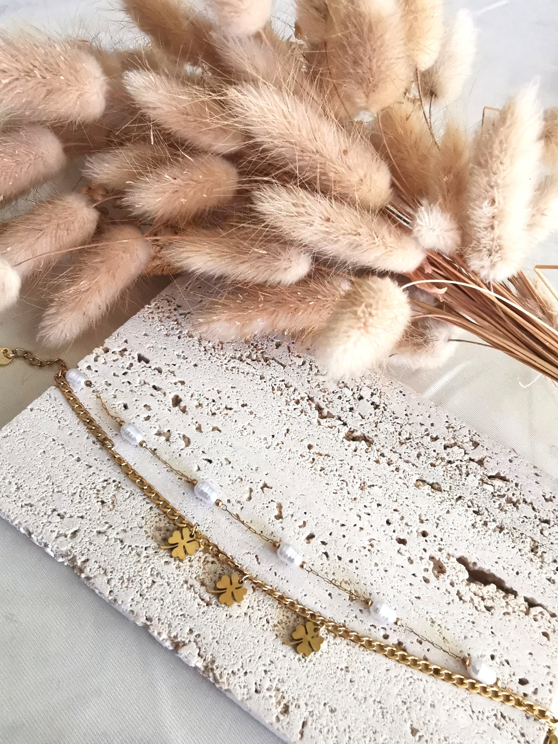 Ce bracelet élégant est composé de perles d'eau douce et de petites breloques en forme de trèfle pour un look unique et raffiné.