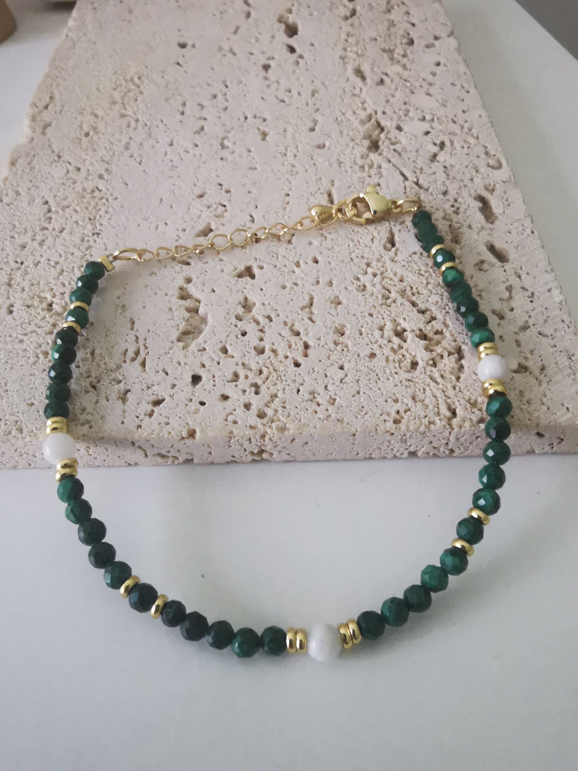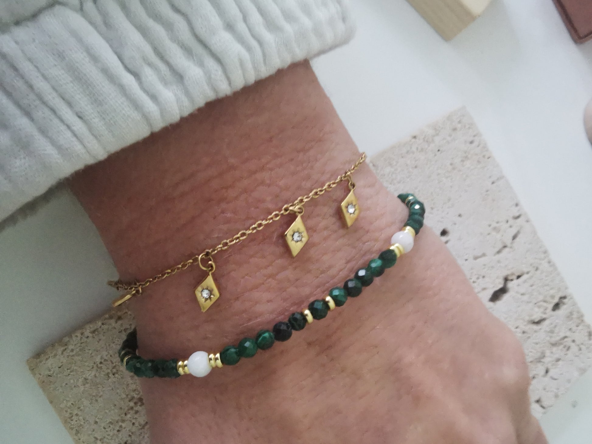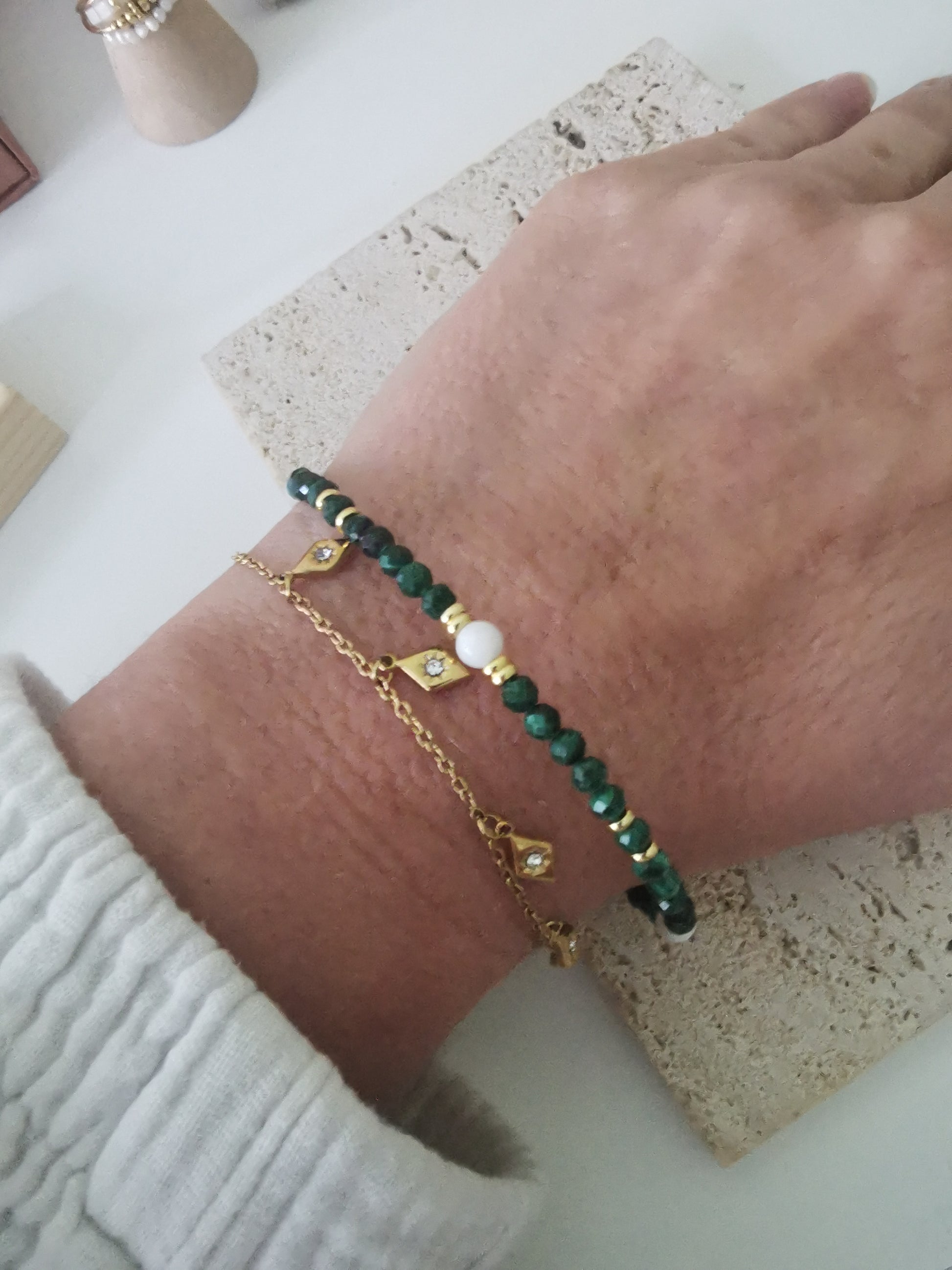 Magnifique bracelet sur fil orné de perles en acier inoxydable, perles d'eau douce et de pierres naturelles Malachite.