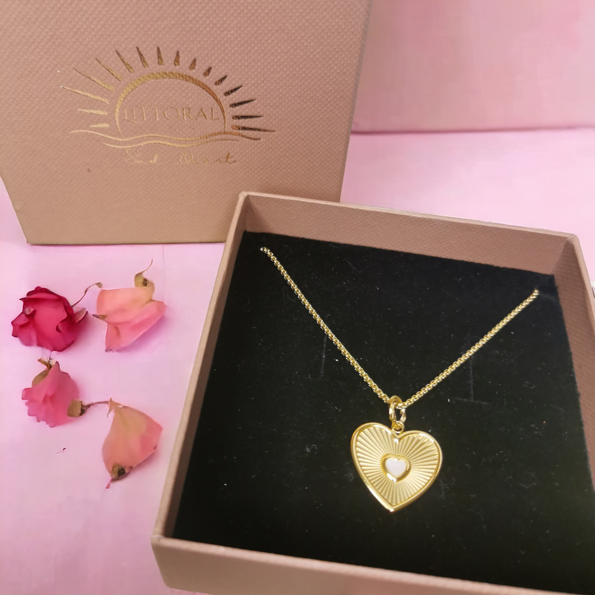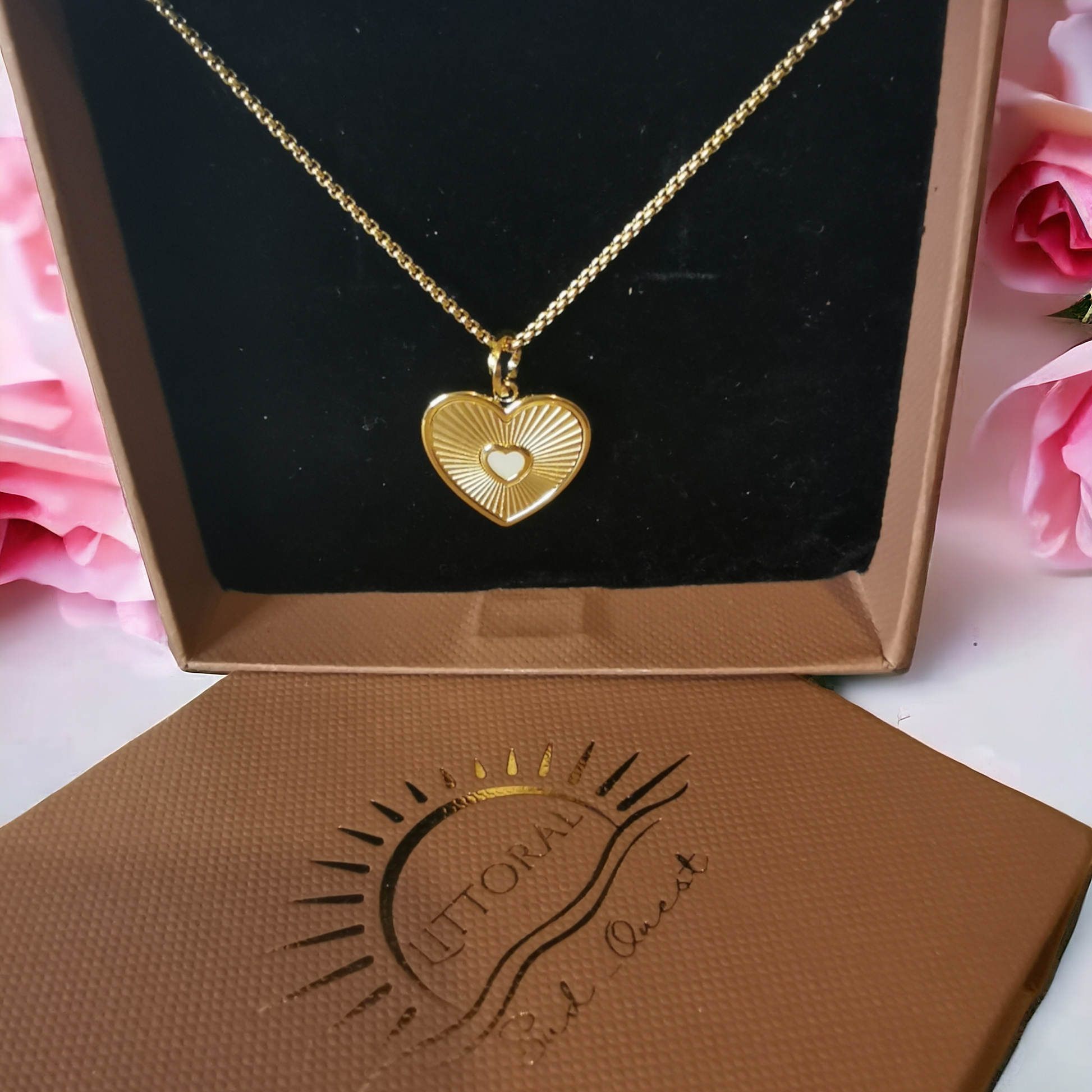 Ce Coffret contient un Collier En Acier inoxydable ornée d'un cœur en Nacre.