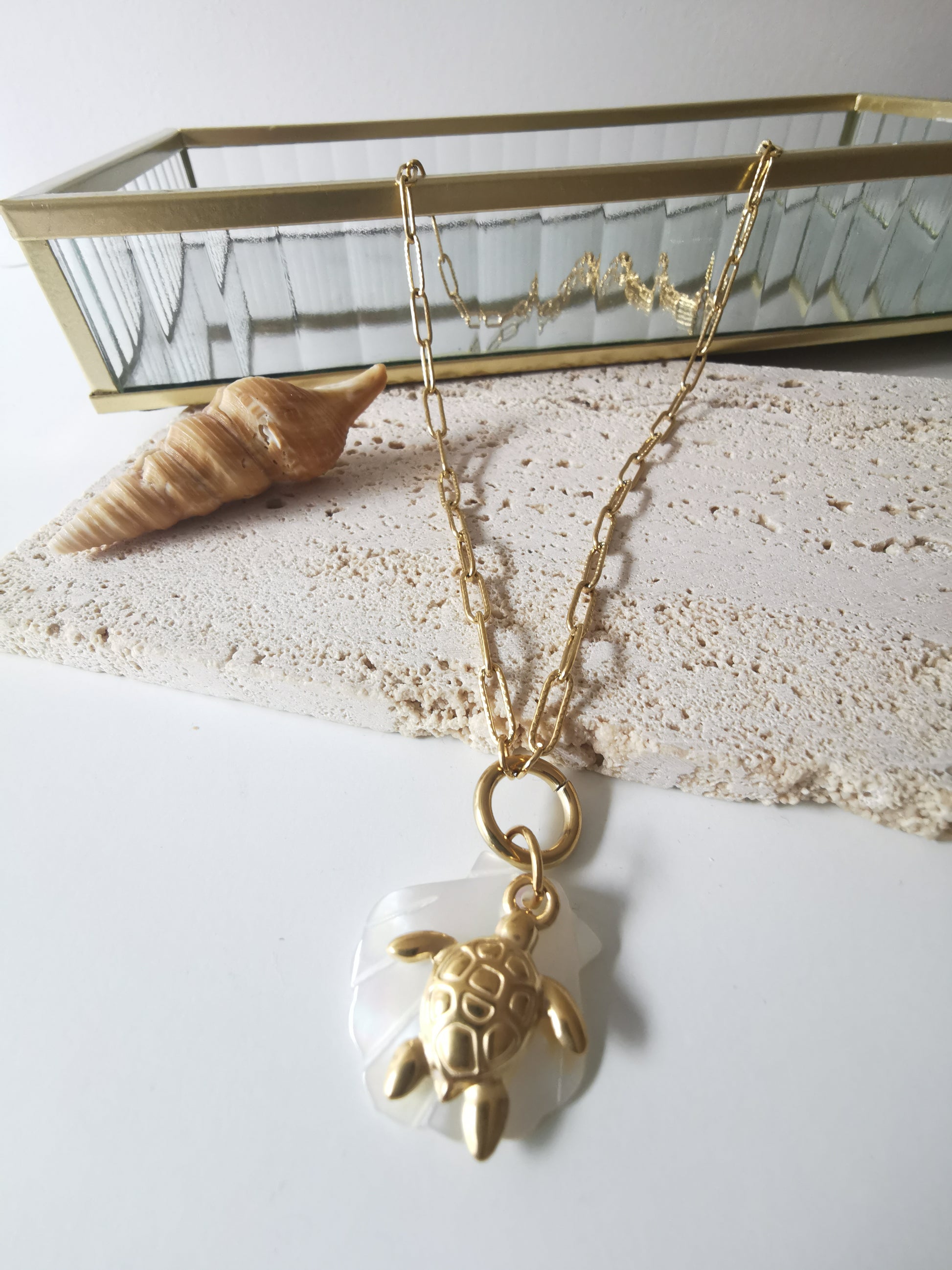 - Pendentif Coquillage en Nacre et tortue en Acier inoxydable.