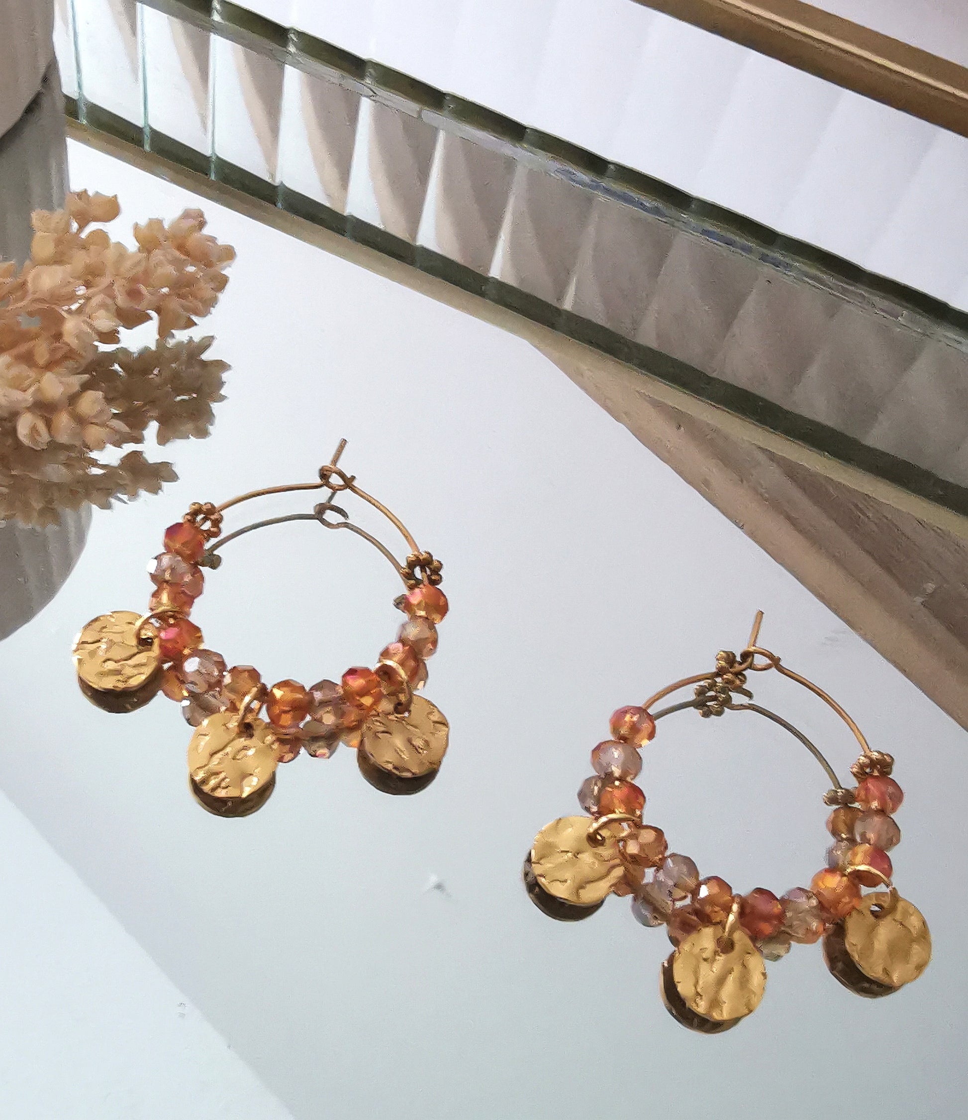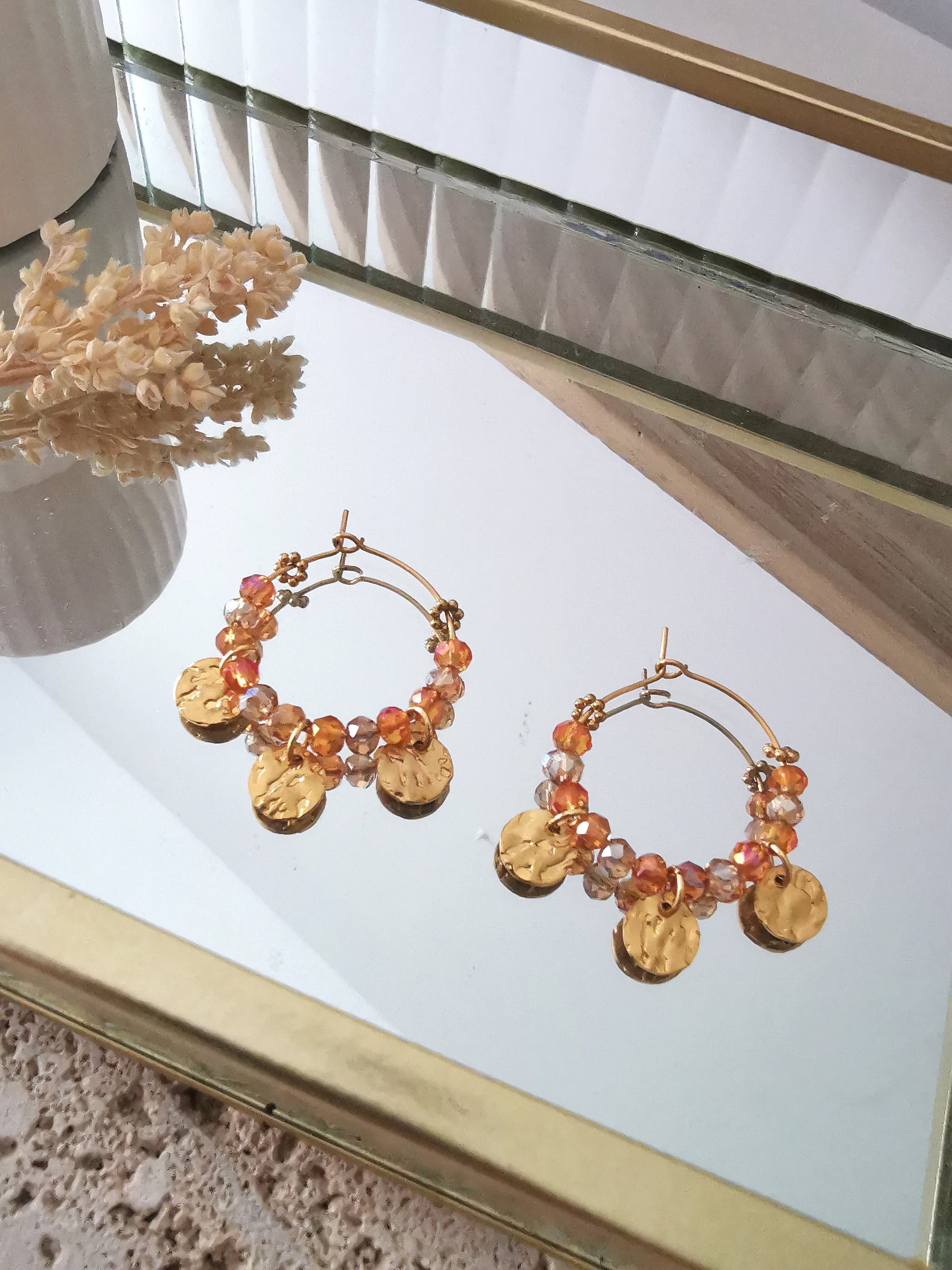 Égayez votre style avec nos créoles ornées de pampilles dorées et de perles facetées au couleur de l'automne fabriquées en acier inoxydable pour un éclat durable.