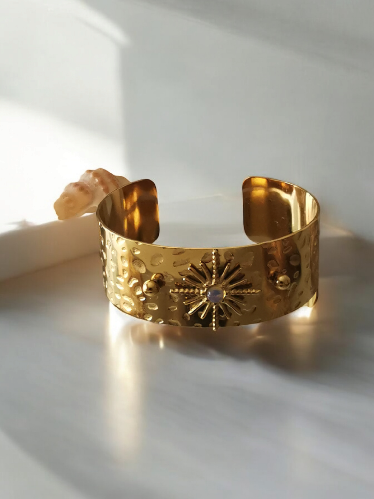 Avec sa finition martelée élégante et don petit soleil serti d'une petite pierre naturelle.