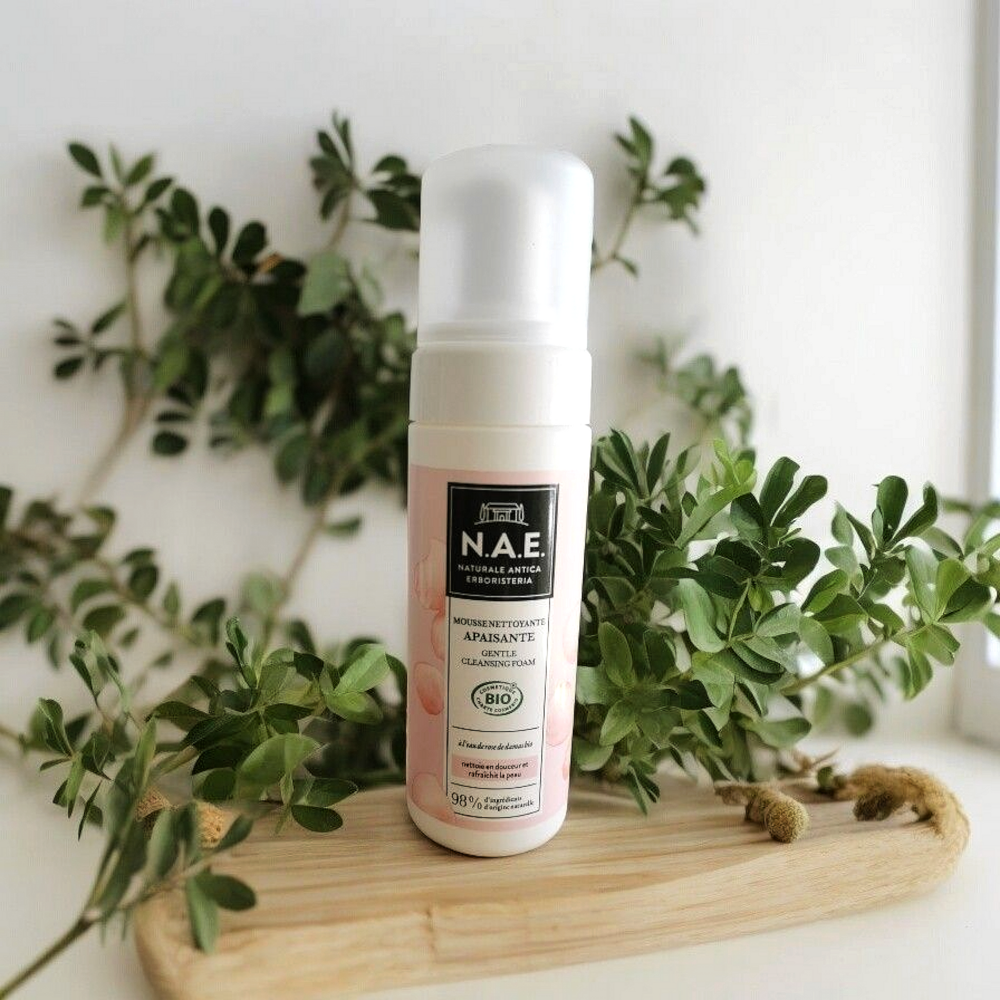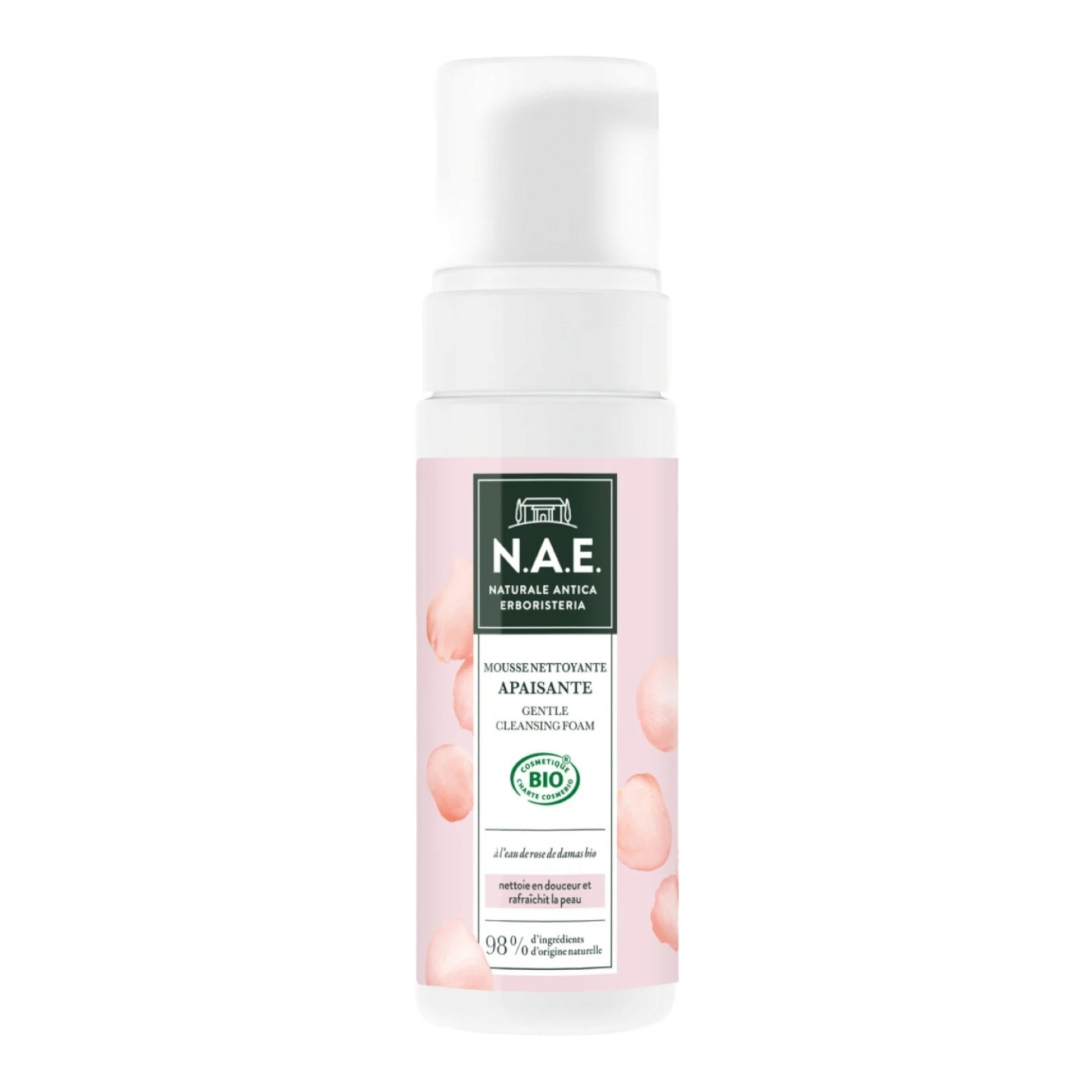 La mousse nettoyante apaisante à l'eau de rose de Damas bio nettoie et démaquille délicatement la peau.